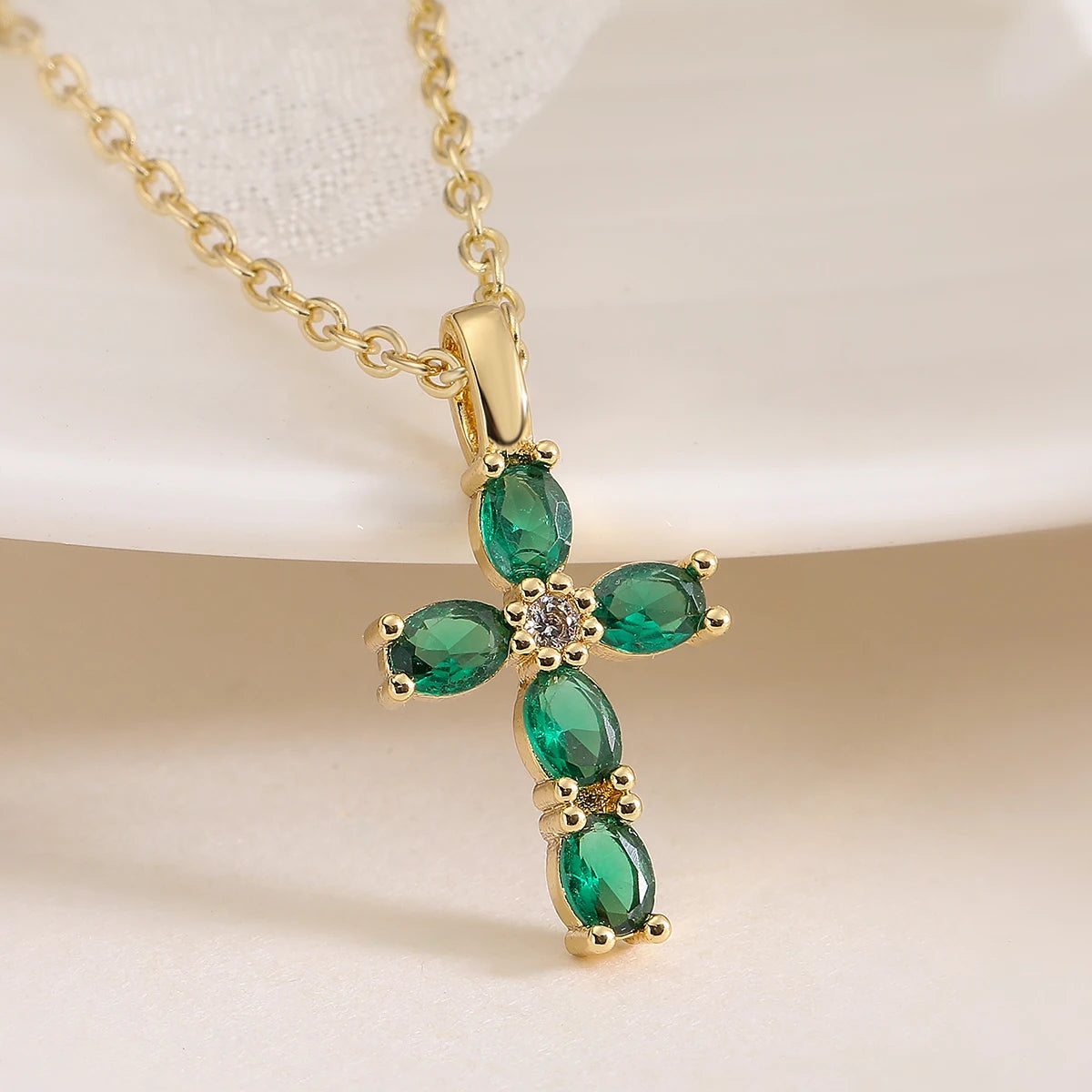 2025 New Arrival Green/Pink Crystal CZ Zircon Cross Pendant Gold Chain Necklaces For Elegant Women Party Accessories