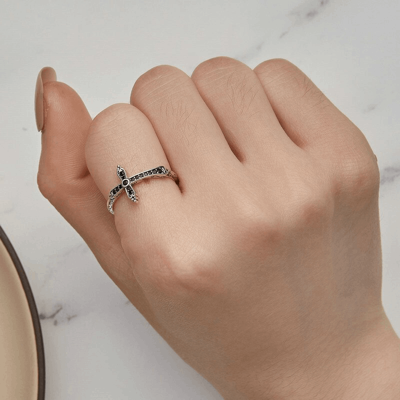 Gothische Kreuzring aus Silber, eine fesselnde Kreation, die das Geheimnis des gothischen Stils mit der Eleganz des Kreuzrings vereint.