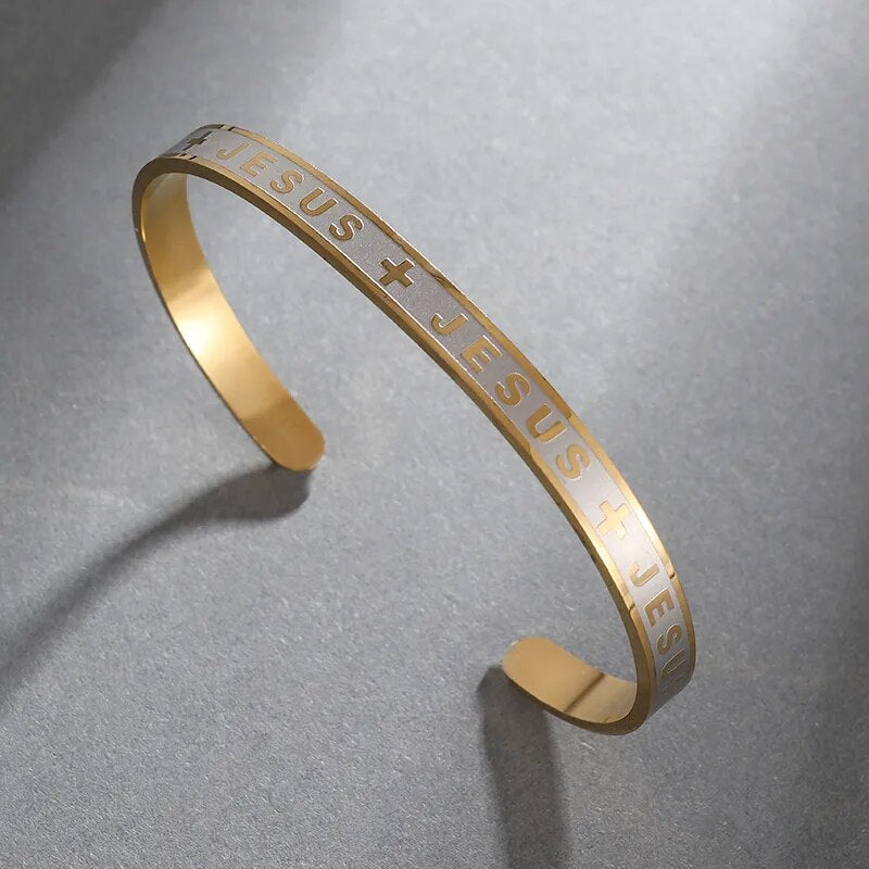 Das Armband hat ein glänzendes Finish mit dem Wort "JESUS" in Großbuchstaben, das gleichmäßig um den Armreif herum eingraviert ist. Zwischen jeder Wiederholung des Wortes "JESUS" befindet sich ein eingraviertes Kreuz. Der Armreif hat offene Enden, die es ermöglichen, ihn an verschiedene Handgelenkgrößen anzupassen. Das Design ist einfach, aber bedeutungsvoll, was es zu einer eleganten Wahl für diejenigen macht, die ihren Glauben auf diskrete und stilvolle Weise zeigen möchten.