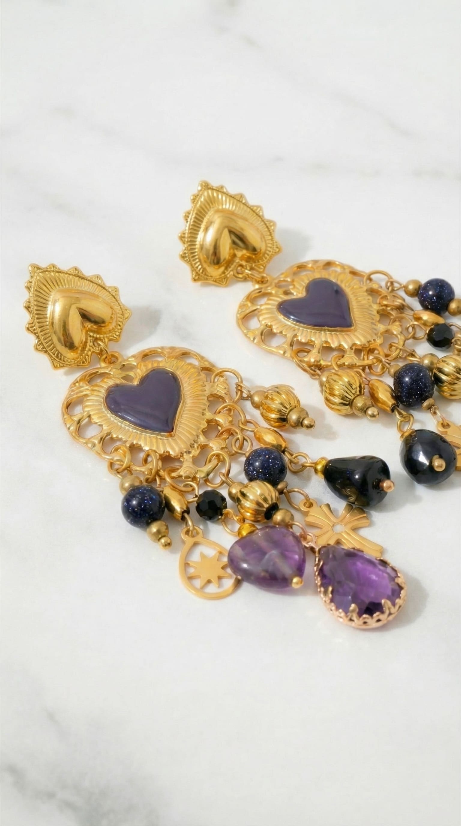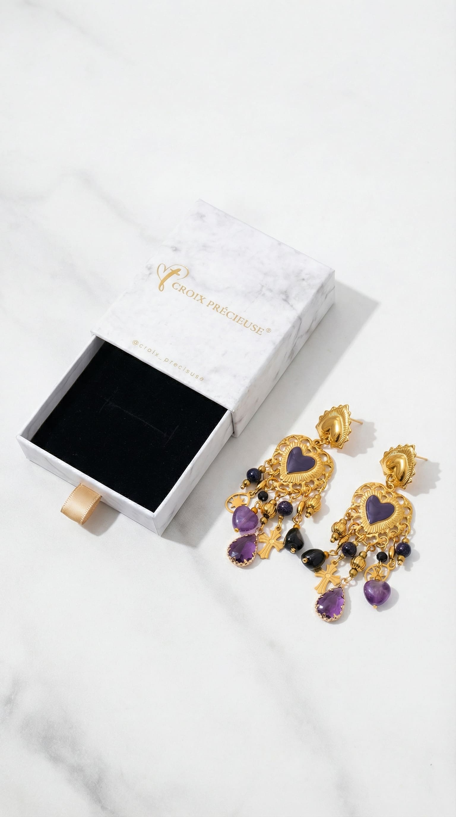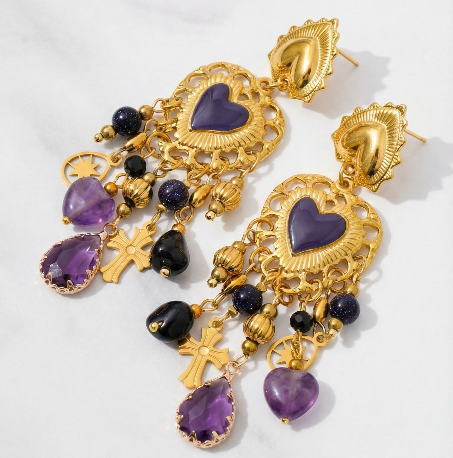 En dessous, de multiples pampilles ornées de pierres violettes facettées, perles sombres et éléments métalliques créent un mouvement fluide et lumineux à chaque geste. Les petites croix suspendues renforcent le caractère symbolique du modèle et apportent une touche spirituelle subtile.