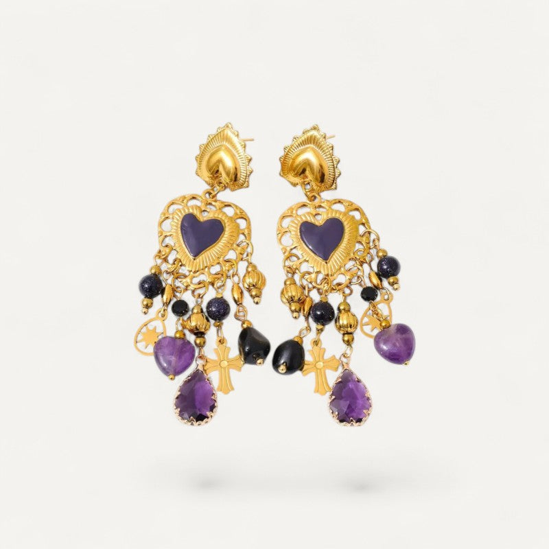 Les Boucles d’Oreilles Croix à Pampilles séduisent par leur design travaillé et leur silhouette généreuse. La partie supérieure met en valeur un cœur central coloré, entouré d’un motif finement ajouré qui apporte relief et élégance.